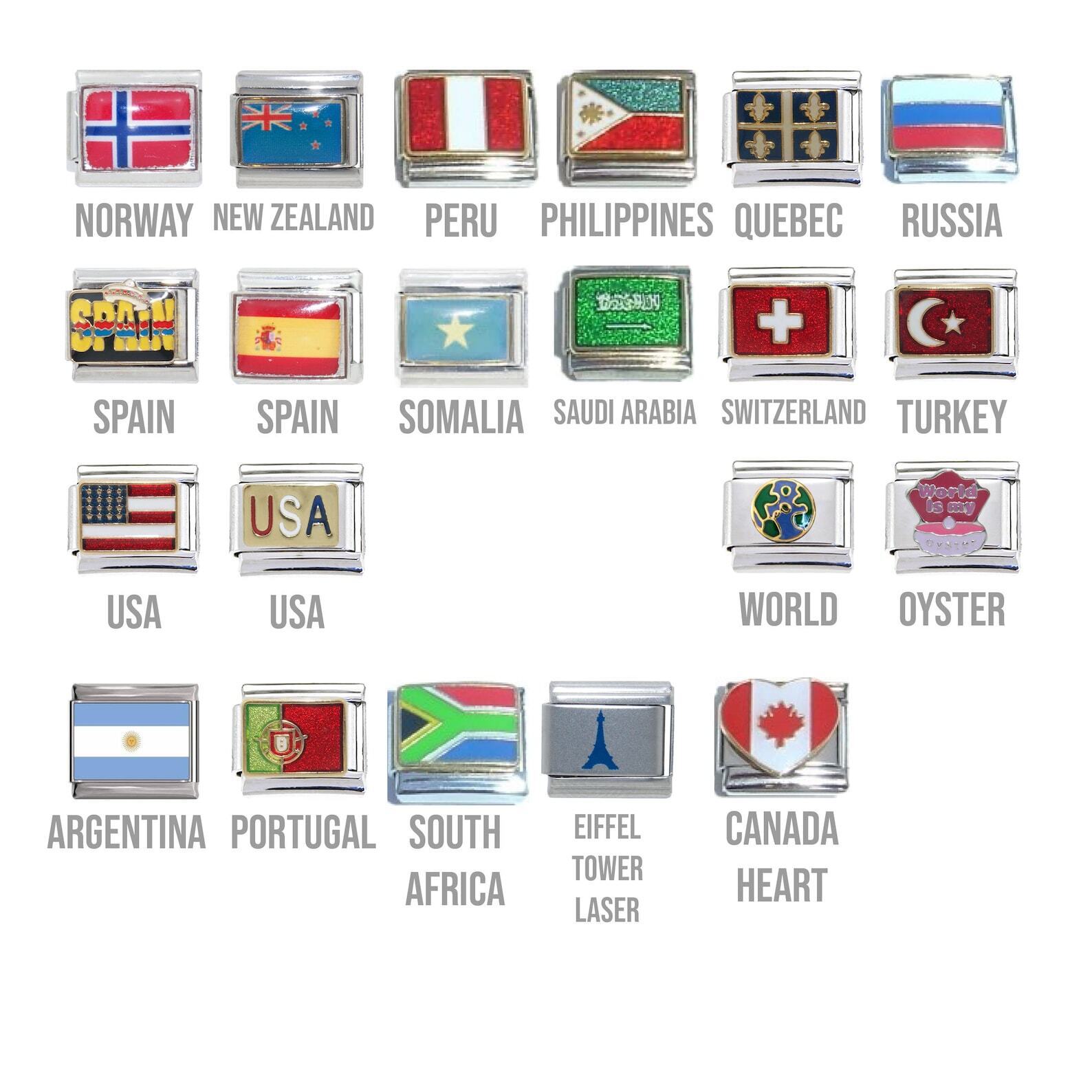 Celebrate global style with these exquisite 9mm Italian charms, featuring iconic flags and famous landmarks from around the world — including Canada, Italy, Cuba, Egypt, and the Pyramids.