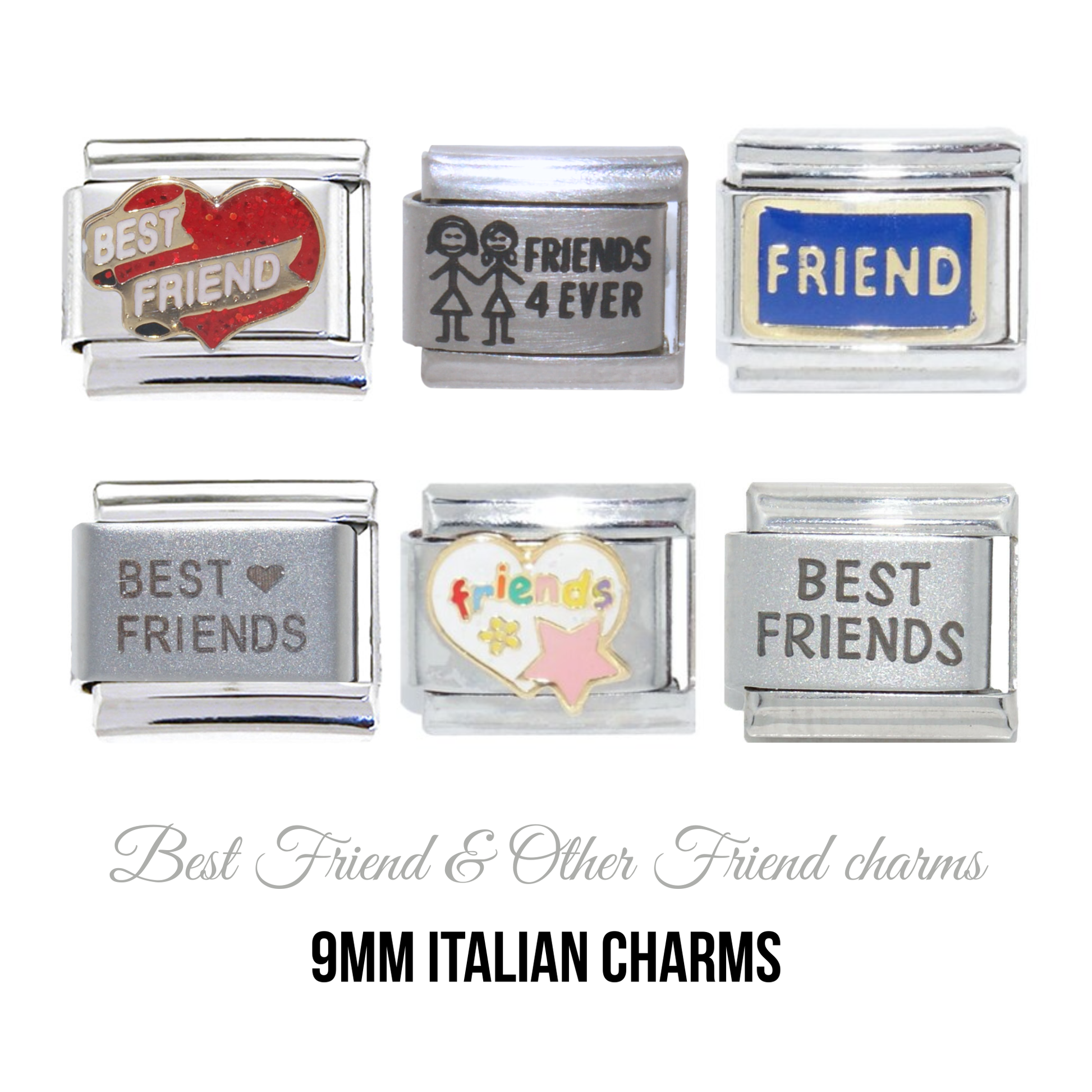 Celebrate lasting bonds with the Friendship 9mm Italian charm, crafted to fit all standard 9mm Italian charm bracelets. Symbolizing friendship and connection, this charm features heartfelt designs and words like Friend, Best Friend, BFF, and Friends 4 Eva. Expertly made for a seamless fit, it’s a meaningful way to honor special relationships while adding a touch of elegance and sentiment to your charm collection