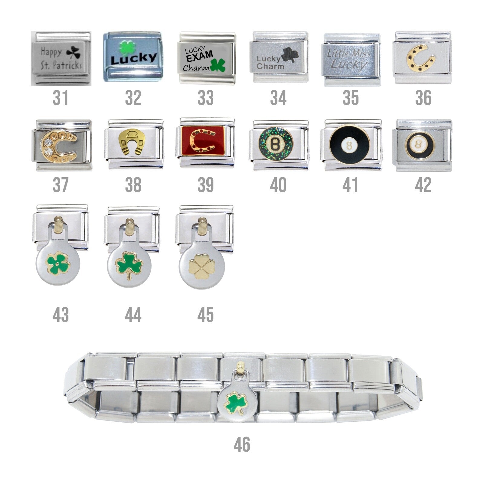 Celebrate luck and heritage with this beautifully crafted 9mm Italian charm, perfectly designed to fit all standard 9mm Italian charm bracelets. Featuring iconic symbols such as the shamrock, clover, horseshoe, and magic eight Ball, along with the flags of Ireland and Northern Ireland, this charm blends cultural pride with timeless symbols of good fortune. With its precise fit and durable construction, it integrates seamlessly into your bracelet—adding both style and meaningful significance to your collection