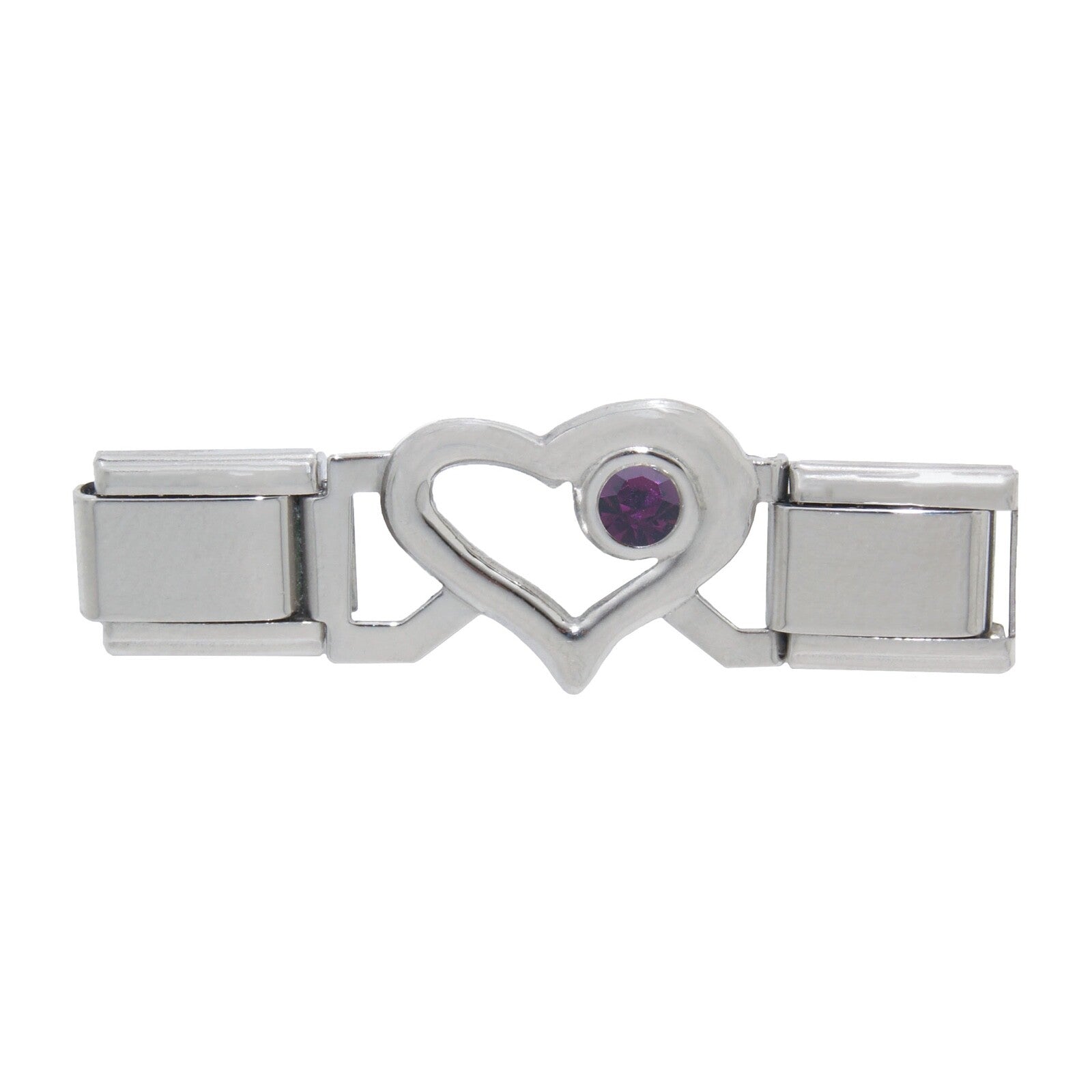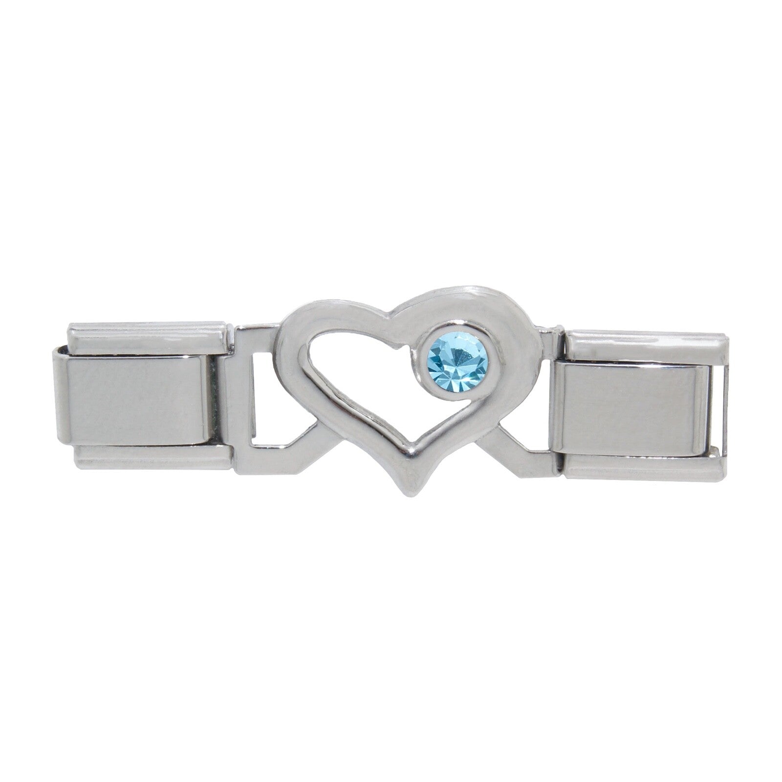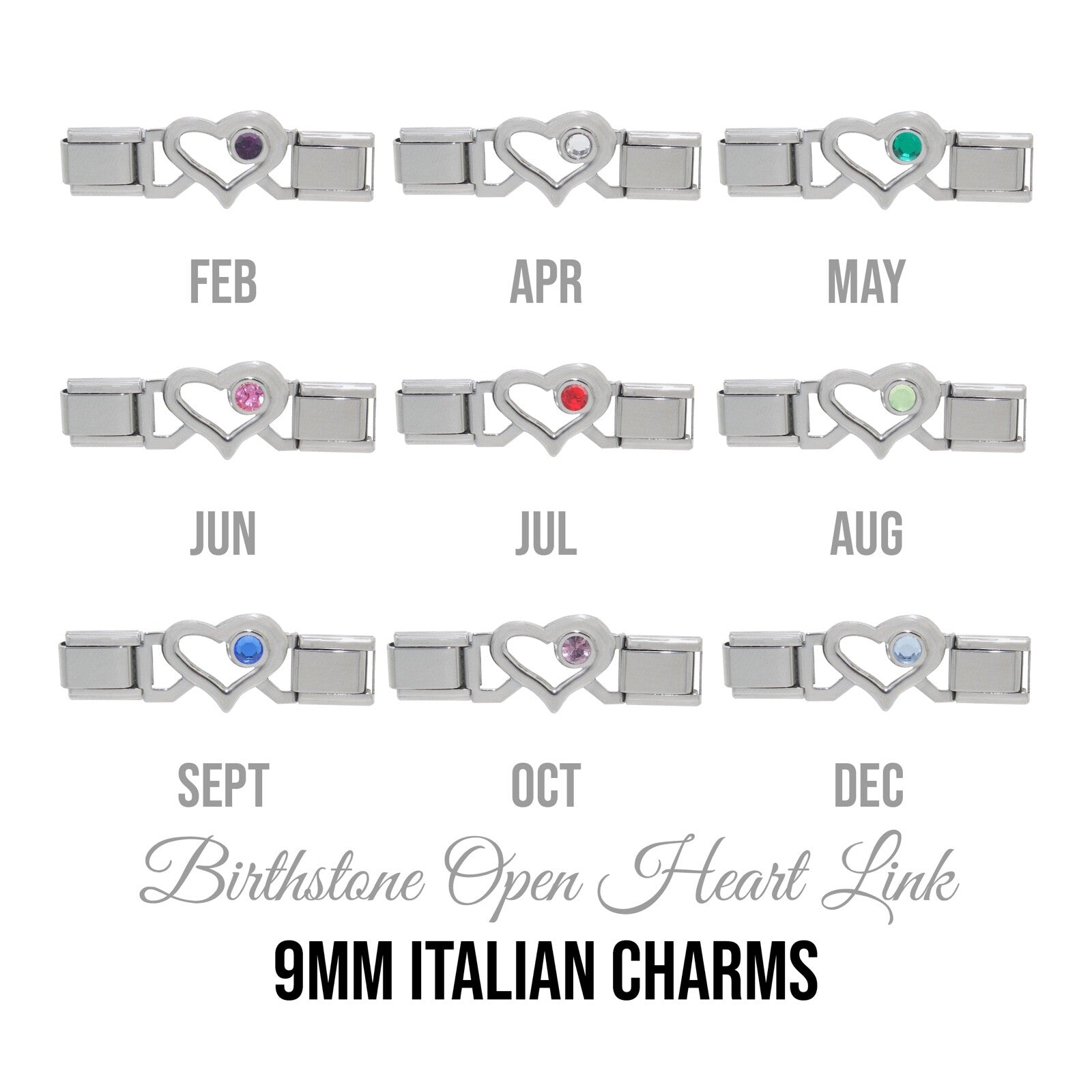 This Open Heart Birthstone Connector Link is specially designed to fit 9mm classic Italian charm bracelets, occupying four spaces for a perfectly balanced and elegant look.